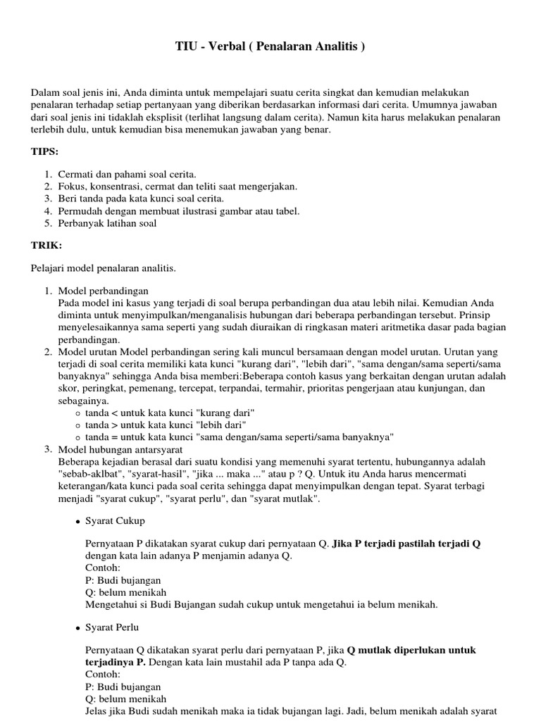 Tes Penalaran Analitis from imgv2-2-f.scribdassets.com View tes penalaran analitis.pdf from empresas 1010 at saint mary's college of california. Nov 06, 2018 · contoh soal cpns 2018: Ada dua bentuk tes penalaran analitik dalam sbmptn, yakni analitik pilihan dan analitik urutan. Oke yuk langsung di coba sob. Apr 12, 2018 · biasanya, tes penalaran analitik dalam sbmptn berupa soal bacaan panjang dengan beberapa informasi rumit yang kemudian diberi beberapa pertanyaan terkait bacaan tersebut. Sep 26, 2017 · nah kali ini contohsoaltpa.com akan berbagi contoh soal tes potensi akademik untuk penalaran analitis, kami sudah menyiapkan 30 soal simulasi dan juga sudah di sertai dengan pembahasan jawabannya. Tes penalaran analitik atau bisa disebut juga analitis merupakan tes penalaran yang menguji kemampuan sobat dalam menganalisa suatu informasi berbentuk teks paragraf serta memanipulasi informasi atau data tersebut untuk menyimpulkan suatu masalah dan mengambil suatu. Tiga anak mengambil kaus, sedangkan gunawan hanya mengambil jaket.