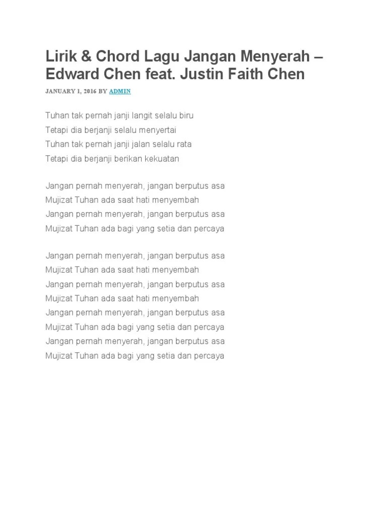Chordify is your #1 platform . Fotos da linha do tempo · 25 de ago de . Berikut ini lirik lagu rohani dan chord kunci gitar 'jangan pernah menyerah' (tuhan tak pernah janji) milik edward chen. Mujizat tuhan ada bagi yang setia dan percaya. Tuhan tak pernah janji langit selalu biru tetapi dia berjanji selalu menyertai tuhan tak pernah janji jalan selalu rata tetapi dia berjanji berikan kekuatan . Tetapi dia berjanji selalu menyertai. Jika tdk keberatan jangan di skip iklannya s. Tuhan tak pernah janji langit selalu biru. Tuhan tak pernah janji jalan selalu rata Layanan mobile dari situs entertainment. Tuhan tak pernah janji langit selalu biru. Tuhan tak pernah janji langit selalu biru. Batang air ini admin mau berdiskusi tulisan tentang lirik tuhan tak pernah janji langit selalu biru.